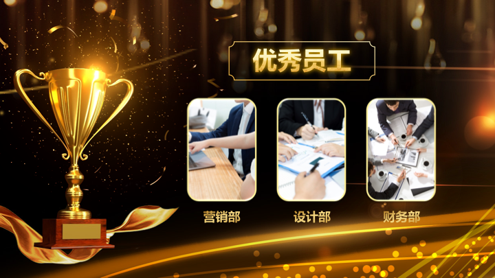 - 设计风格:整体采用大气奢华的黑金风格,通过黑色背景与金色粒子、光效、奖杯等元素的结合,营造出高端、隆重的视觉效果,极具仪式感。