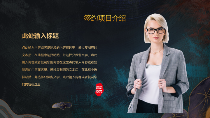 - 图文并茂:提供了丰富的图文版式,您可以轻松替换公司的LOGO、团队照片和具体文案,快速定制出一份专属的启动仪式演示文稿。