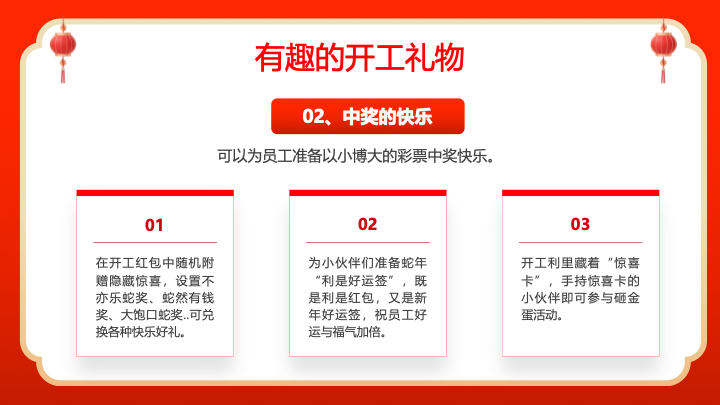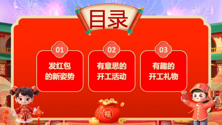 本模板是各类企业、单位的人力、行政部门策划“开工大吉”活动、新春团拜会的绝佳工具。其活泼新潮的风格尤其受到年轻化团队的喜爱,能够帮助您清晰地呈现活动方案,营造欢乐、积极的开工氛围。