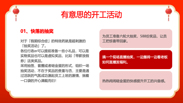 - 活动策划:每个环节都提供了详细的执行建议和注意事项,例如“开工仪式”中的暖场互动,“趣味游戏”中的游戏规则介绍,为您策划活动提供完整思路。