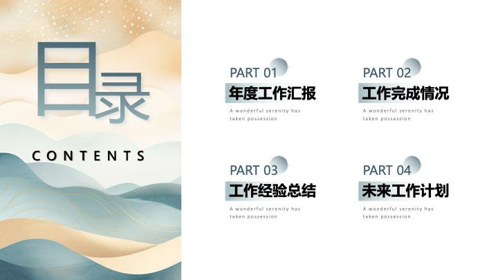 用一幅写意的山水画卷,为您的年度工作做一次深度而富有格调的总结。这是一款专为年终汇报设计的简约创意国潮风PPT模板。模板以淡雅的浅色为背景,巧妙地融合了水墨山峦、传统窗格、祥云等古典中式元素,并以现代、简约的版式进行重构,整体风格清雅、宁静且充满创意。
