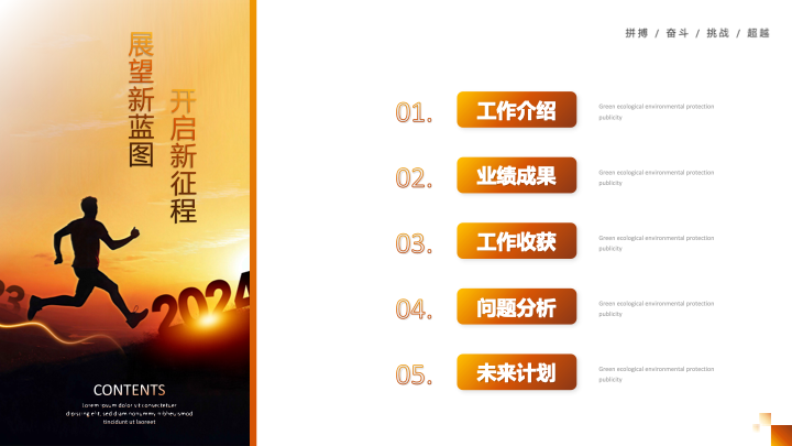 以下为模板内部核心页面的截图预览,您可以直观地感受到其充满力量感的励志设计和完整的工作汇报框架。