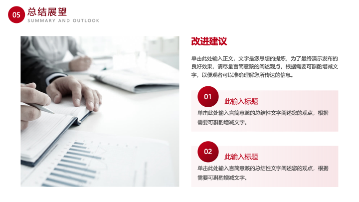 - 图文并茂:提供了丰富的图文版式,您可以轻松替换公司LOGO、项目图片和具体文案,快速制作出一份重点突出、气势十足的汇报文稿。