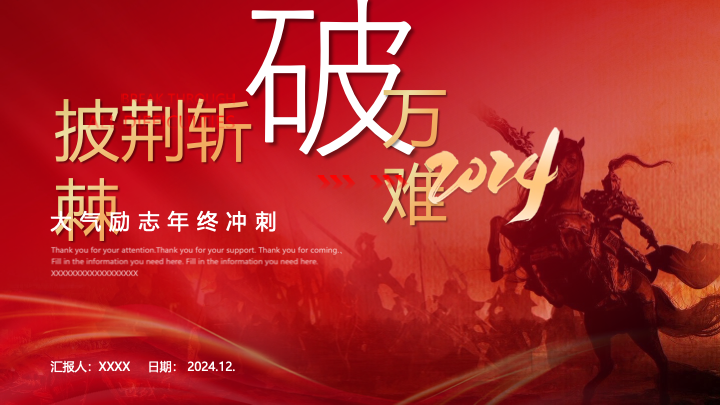 用一份充满力量与挑战精神的演示文稿,为一年的奋斗与拼搏喝彩。这是一款专为年终总结汇报设计的创意励志风格PPT模板。模板以深邃的暗色为背景,搭配激情的红色,并以“挑战者”剪影作为核心视觉符号,营造出一种不畏艰难、勇于挑战、不断超越的磅礴气势,是您展示年度战绩、激励团队士气的绝佳选择。