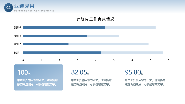 - 图文并茂:提供了丰富的图文版式,您可以轻松替换公司LOGO、项目图片和具体文案,快速制作出一份重点突出、气势十足的汇报文稿。