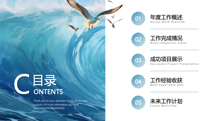 - 内容框架:模板内置了完整的工作汇报逻辑框架,包含“年度工作概述”、“工作完成情况”、“成功项目展示”、“工作经验收获”和“未来工作计划”五个核心环节,帮助您全面梳理年度工作。