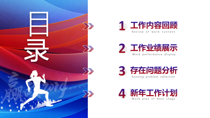 该PPT模板结构严谨,逻辑清晰,围绕年度工作的回顾与规划,设置了四个标准的商务汇报模块,旨在进行全面的复盘与展望。