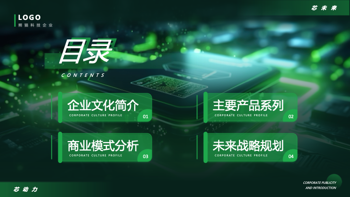 - 封面与目录页:封面设计以“公司宣传介绍”为主题,采用简约的墨绿色块,风格稳重大方。目录页延续此风格,清晰地导航了“公司简介”、“产品与服务”、“文化及荣誉”、“规划与未来”四个核心部分。