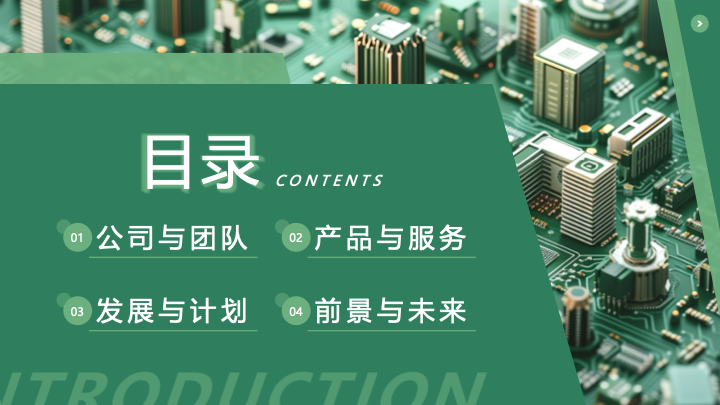 • 封面与目录页:封面设计以“公司宣传介绍”为主题,采用简约的墨绿色块,风格稳重大方。目录页延续此风格,清晰地导航了“公司简介”、“产品与服务”、“文化及荣誉”、“规划与未来”四个核心部分。