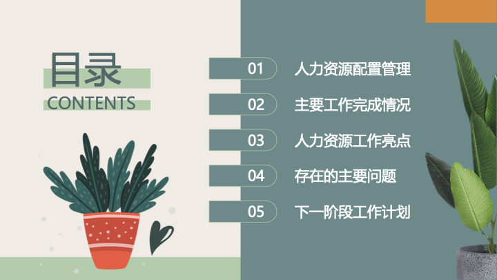 - 封面与目录页:封面以雅致的植物插画勾勒出汇报主题,风格清新独特。目录页延续了植物元素,通过简约的列表清晰地导航了“人力资源配置管理”、“主要工作完成情况”、“人力资源工作亮点”、“工作存在主要问题”和“明年工作计划安排”五个核心模块。