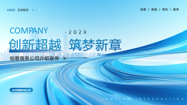 这是一款视觉通透、风格简约的清新商务风公司介绍暨产品宣传PPT模板。模板以明亮的现代都市建筑摄影为背景,搭配大量留白和清爽的蓝色系配色,营造出一种开阔、专业、充满信赖感的视觉氛围。整体设计干净利落,非常适合企业用于品牌宣传、产品介绍或商业计划书,展现企业的现代化形象与专业实力。