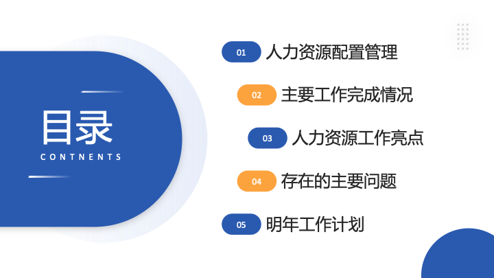 - 封面与目录页:封面设计以“人力资源年终总结”为主题,风格清新简约。目录页通过数字引导和色块区分,清晰地展示了“人力资源配置管理”、“主要工作完成情况”、“人力资源工作亮点”、“存在的主要问题”和“明年工作计划”五个核心模块。