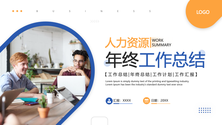 - 主要工作完成情况:详细地从招聘、人事管理、培训、绩效、薪酬、专项工作、团队建设等多个维度进行阐述,并配有专业的商务摄影图和简洁的图标,内容丰富且专业。