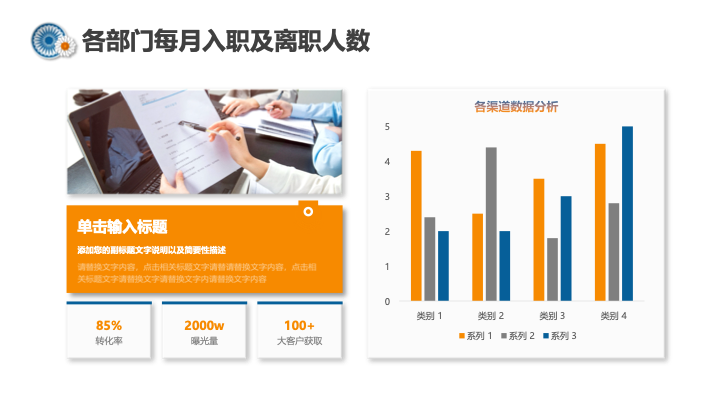 - 人力资源配置管理:此章节包含招聘渠道对比、周边市场比较、入离职分析等专业HR数据图表,为数据化呈现人力资源现状提供了清新直观的视觉方案。