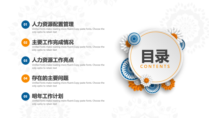 - 封面与目录页:封面设计清新雅致,以剪纸花卉元素点缀,突出“人力资源工作汇报”的主题。目录页延续了简约风格,清晰地导航了“人力资源配置管理”、“主要工作完成情况”、“人力资源工作亮点”、“存在的主要问题”和“明年工作计划”五个核心模块。