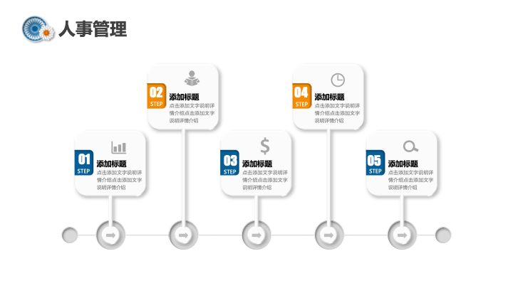 该PPT模板的框架结构非常完整,深度聚焦于人力资源管理的各项核心职能,共包含五个关键部分,逻辑严谨,内容全面。