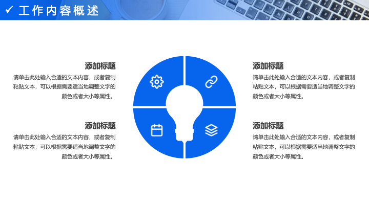 该PPT模板结构完整,逻辑清晰,围绕年度工作的核心环节,设置了四个标准化的内容模块,旨在帮助使用者进行全面的复盘与规划。