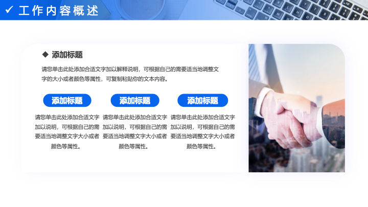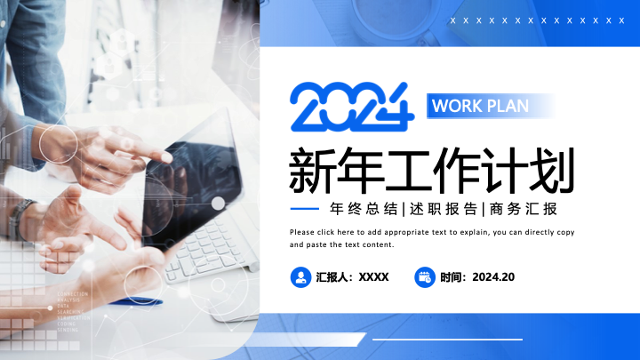 这是一款风格清新、版式简约的现代商务风新年工作计划PPT模板。模板以明亮的办公场景摄影图为背景,搭配大量留白和清爽的蓝色点缀,营造出一种干净、有序、充满活力的工作氛围。整体设计注重信息的清晰呈现,非常适合企业、团队或个人进行年度总结、新年规划等各类商务汇报。