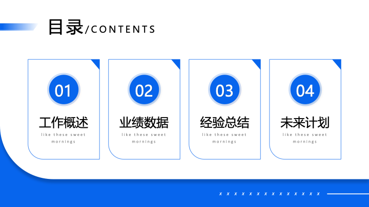 - 封面与目录页:封面以俯拍的整洁桌面为背景,直观传达“新年工作计划”的主题,风格清新简约。目录页设计采用网格布局,清晰地导航“工作概述”、“业绩数据”、“经验总结”、“未来计划”四大核心部分。