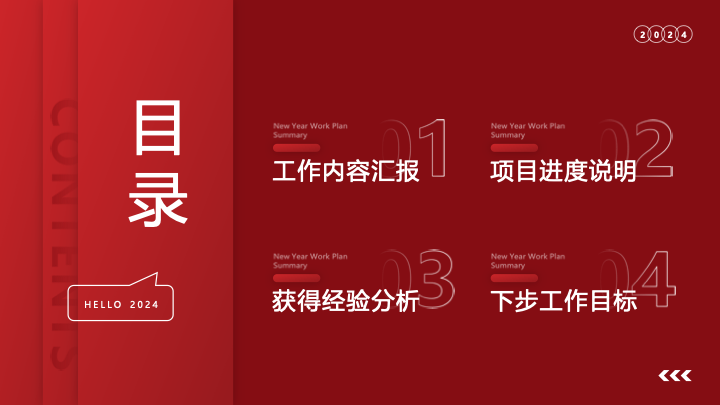 - 封面与目录页:封面以俯拍的整洁桌面为背景,直观传达“新年工作计划”的主题,风格清新简约。目录页设计采用网格布局,清晰地导航“工作概述”、“业绩数据”、“经验总结”、“未来计划”四大核心部分。