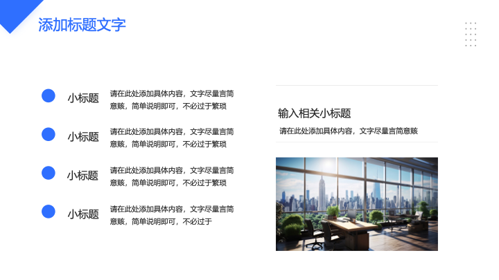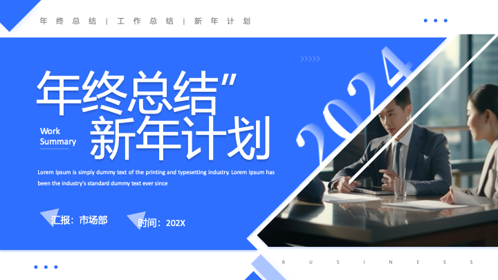 这是一款风格清新、版式简约的现代商务风新年工作计划PPT模板。模板以明亮的办公场景摄影图为背景,搭配大量留白和清爽的蓝色点缀,营造出一种干净、有序、充满活力的工作氛围。整体设计注重信息的清晰呈现,非常适合企业、团队或个人进行年度总结、新年规划等各类商务汇报。