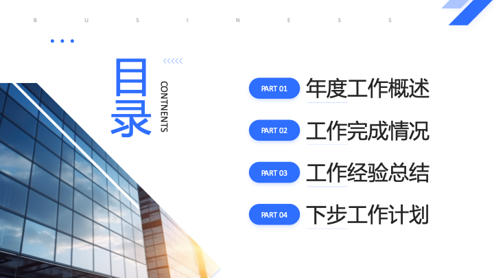 • 封面与目录页:封面以俯拍的整洁桌面为背景,直观传达“新年工作计划”的主题,风格清新简约。目录页设计采用网格布局,清晰地导航“工作概述”、“业绩数据”、“经验总结”、“未来计划”四大核心部分。