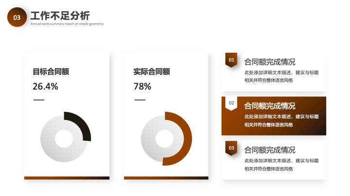 - 专业数据图表:包含环形百分比图、数据列表等多种数据可视化图表,设计与整体风格统一,便于直观地呈现工作成果和数据分析。