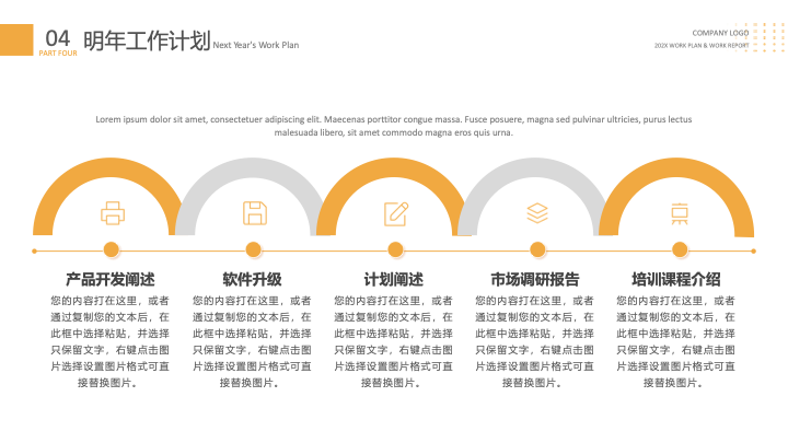 该PPT模板结构完整,逻辑清晰,围绕个人年度工作的回顾与展望,设置了四个核心内容模块,旨在进行全面的复盘与规划。