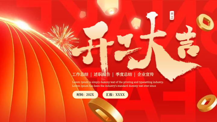 用一场红火喜庆的视觉盛宴,迎接新一年的奋斗征程。这是一款专为企业“开工大吉”活动设计的红色国潮风PPT模板。模板以激情的中国红与华丽的金色为主色调,深度融合了财神、元宝、祥云、灯笼等充满美好寓意的传统新年元素,整体风格大气磅礴、催人奋进,是您举办开工动员大会、鼓舞团队士气的绝佳选择。