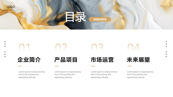 - 封面与目录页:封面以“公司宣传介绍”为主题,配以雅致的水墨山水背景,奠定了模板沉稳大气的基调。目录页清晰地导航了“公司与团队”、“产品与服务”、“市场与营销”、“发展与计划”四个核心部分。