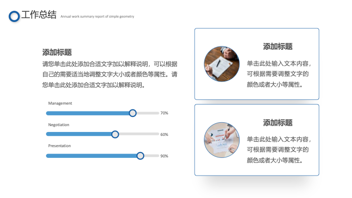 • 数据可视化图表:包含简洁明了的百分比进度条等数据图表,可用于直观展示项目进度、能力评估或业绩指标,让数据表达更具说服力 。