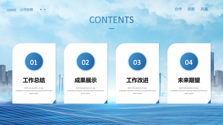 • 封面与目录页:以“迎难而上 不惧前行”为主题,配以宏大的城市天际线背景,视觉冲击力强,能瞬间抓住观众注意力。目录页采用简约设计,清晰导航四大核心模块 。