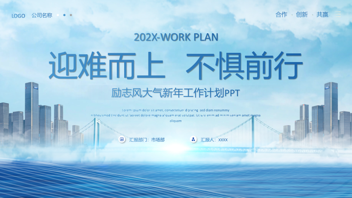 这是一款充满现代感与正能量的励志大气商务风新年工作计划PPT模板。模板以开阔的城市海景和桥梁为视觉背景,采用冷静专业的蓝色调,整体设计传递出一种“迎难而上、不惧前行”的积极精神 。非常适合企业、团队及个人用于展示年度成果、规划未来蓝图,激励团队士气。