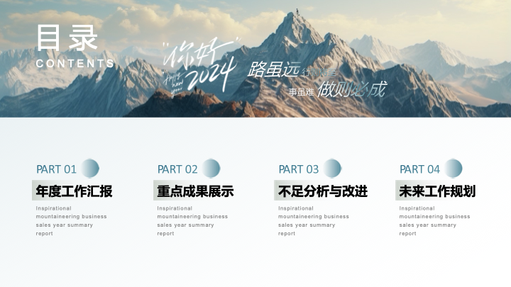 大气励志登山主题年终工作汇报PPT模板 大气励志登山主题年终工作汇报PPT模板 大气励志登山主题年终工作汇报PPT模板 大气励志登山主题年终工作汇报PPT模板以下为模板内部核心页面的截图预览,您可以直观地感受到其充满力量感的登山主题设计和完整的工作汇报框架。