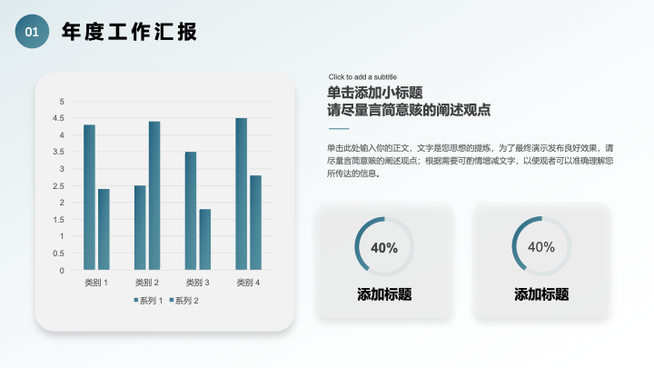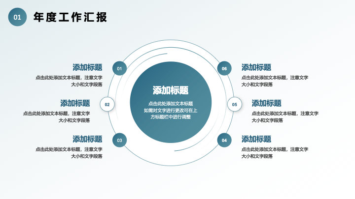 • 可视化图示:内含多种为商务汇报设计的图文版式和逻辑图示,如图标列表、数据图表等,便于清晰地展示年度工作的各项数据、成果与规划。