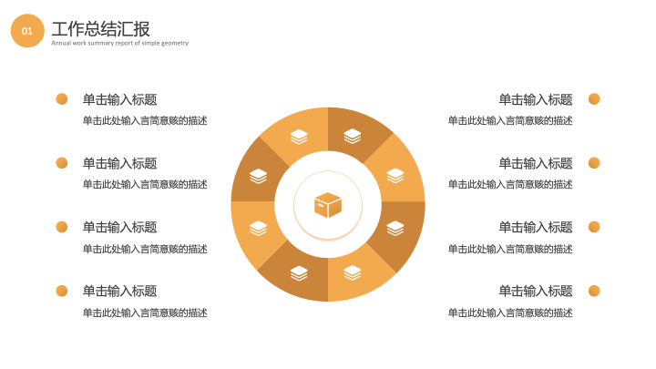 • 可视化图示:内含多种为商务汇报设计的图文版式和逻辑图示,如图标列表、数据图表等,便于清晰地展示年度工作的各项数据、成果与规划。