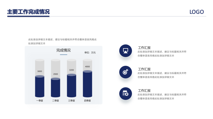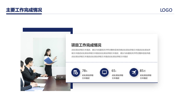 - 图文并茂:提供了丰富的图文版式,您可以轻松替换公司LOGO、项目图片和具体文案,快速制作出一份重点突出、气势十足的汇报文稿。