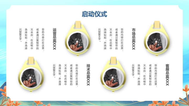 - 图文并茂:提供了丰富的图文版式,您可以轻松替换公司的LOGO、团队照片和具体文案,快速定制出一份专属的启动仪式演示文稿。