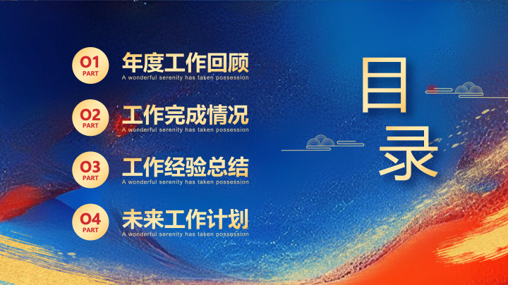 - 封面与目录页:封面以“加油2024”书法字搭配写意山水背景,充满新年活力 。目录页设计简洁,清晰导航“工作总结汇报”、“工作完成情况”、“工作经验总结”、“未来工作计划”四大章节 。