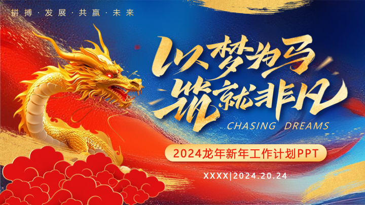 这是一款融合了东方美学与现代简约设计的新中式国潮风新年工作计划PPT模板。模板以蓝金色调的水墨画为背景,如层峦叠嶂的江山画卷,点缀以流动的金色线条,营造出一种雅致、开阔而又充满希望的意境。搭配“加油2024”的活力书法,非常适合用于年终总结、新年规划等场合,彰显汇报者的格调与品味。