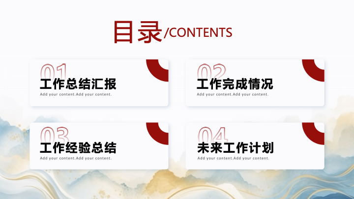 • 封面与目录页:封面以“加油2024”书法字搭配写意山水背景,充满新年活力 。目录页设计简洁,清晰导航“工作总结汇报”、“工作完成情况”、“工作经验总结”、“未来工作计划”四大章节 。