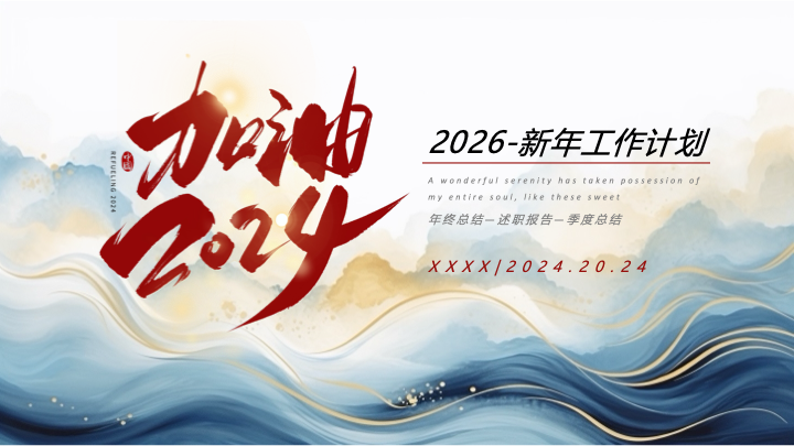 这是一款融合了东方美学与现代简约设计的新中式国潮风新年工作计划PPT模板。模板以蓝金色调的水墨画为背景,如层峦叠嶂的江山画卷,点缀以流动的金色线条,营造出一种雅致、开阔而又充满希望的意境。搭配“加油2024”的活力书法,非常适合用于年终总结、新年规划等场合,彰显汇报者的格调与品味。