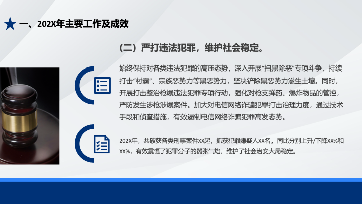 本模板是公安、检察、法院等政法机关及各级党政部门进行年终总结、工作汇报、党建学习、专题报告的专用选择。其简洁、大气的设计风格,完美契合政务汇报的要求,能够营造出庄重、专业的会议氛围。