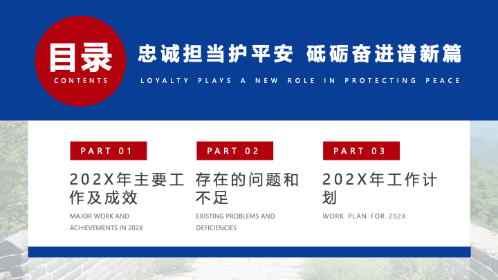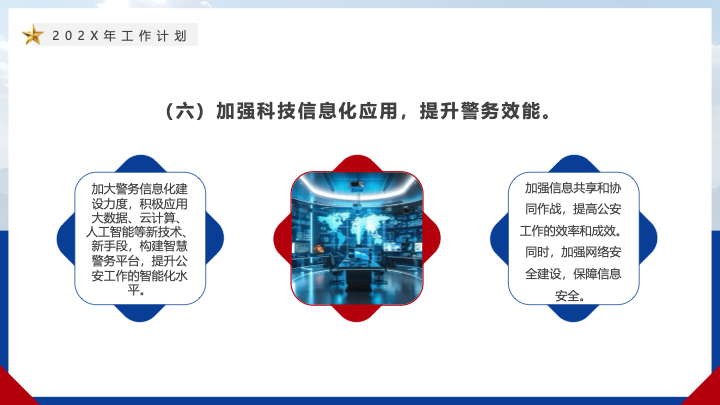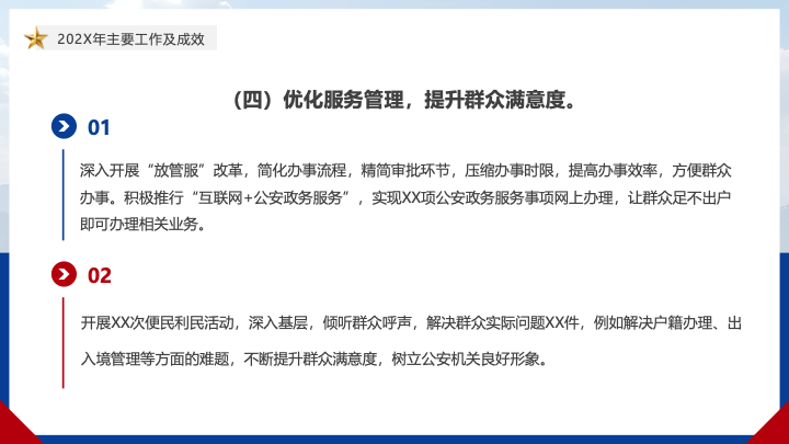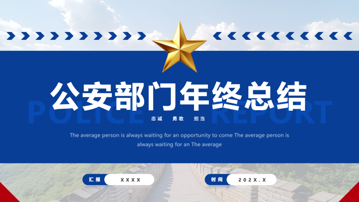 用简洁、专业的视觉语言,全面汇报年度工作成果。这是一款专为党政公安部门设计的简约大气风格年终工作总结PPT模板。模板以经典的红蓝色系搭配干净的浅色背景,并点缀了国徽等庄严元素,整体风格现代、严谨且富有条理,是您进行年终汇报、工作总结的理想选择。