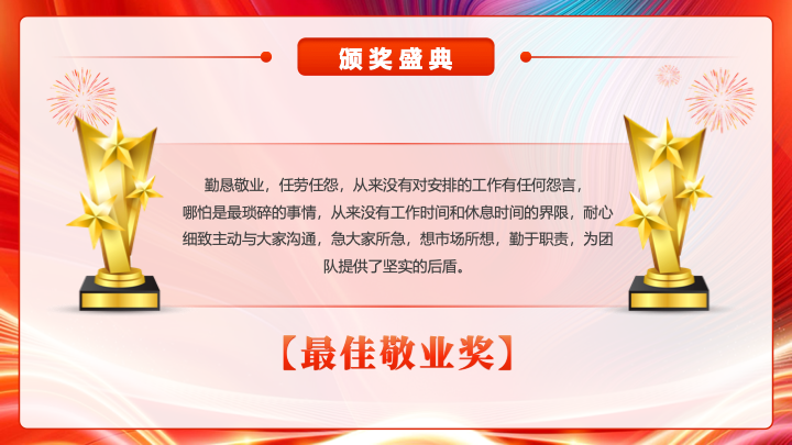 • 颁奖盛典章节:专为颁奖环节设计,包含了最佳敬业奖、最佳奉献奖、最佳团队奖等多个奖项页面,配有奖杯、舞台幕布等视觉元素,仪式感十足。