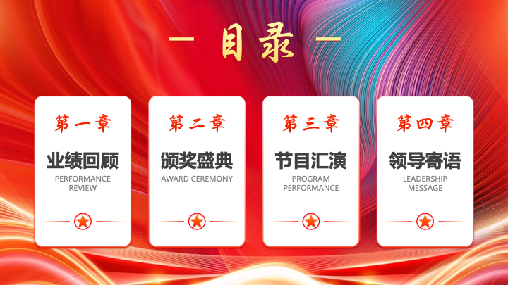 • 封面与目录页:封面以“赋能聚力 展望未来”为主题,配以动感十足的红金光效背景,开场即奠定盛典基调。目录页清晰地展示了“业绩回顾”、“颁奖盛典”、“节目汇演”、“领导寄语”四大活动环节。