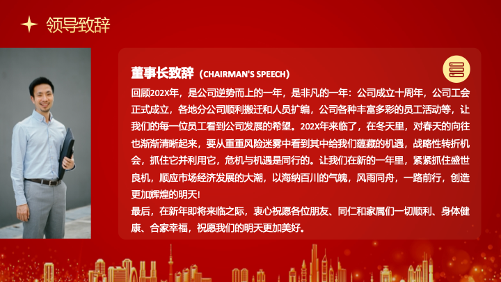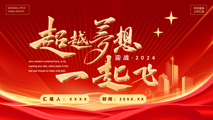 用一场恢弘大气的视觉盛宴,开启年度荣耀新篇章。这是一款专为企业年会盛典设计的红金大气国潮风PPT模板。模板以喜庆的中国红与华丽的金色为主色调,深度融合了传统纹样、光效等视觉元素,整体风格大气磅礴、喜庆庄重,是您举办年度盛典、表彰优秀团队与个人的理想之选。