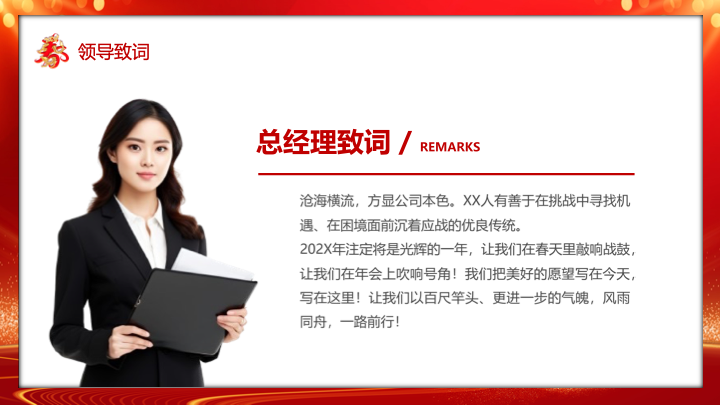 - 设计风格:整体采用大气恢弘的红金配色方案,封面以“聚力谋远,砺行致远”为主题,通过光线、粒子和质感纹理,营造出高端、专业的视觉效果。