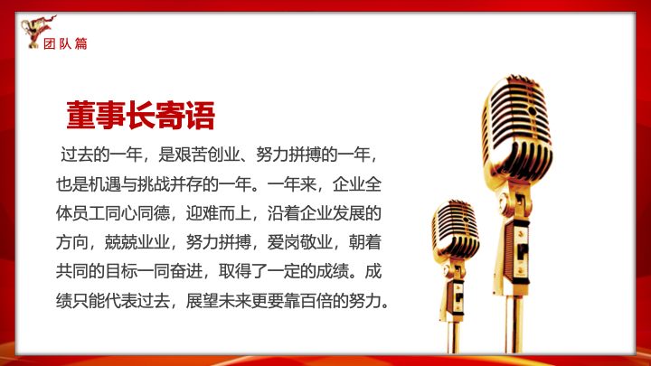 • 设计风格:整体采用大气恢弘的红金配色方案,封面以“聚力谋远,砺行致远”为主题,通过光线、粒子和质感纹理,营造出高端、专业的视觉效果。