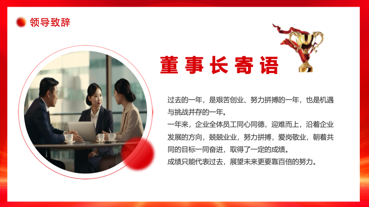 • 设计风格:整体采用大气恢弘的红金配色方案,封面以“聚力谋远,砺行致远”为主题,通过光线、粒子和质感纹理,营造出高端、专业的视觉效果。